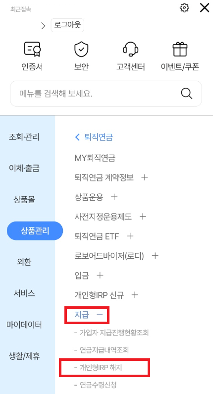 다음과 같은 화면에서 순서대로 '상품관리 - 퇴직연금 - 지급 - 개인형 IRP 해지'를 선택해서 들어갑니다. 간단합니다.